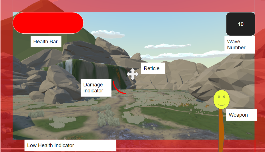 The UI for the game was relatively intuitive as I analysed other games that were first person shooters or roguelikes to see what sort of information I would need to convey. One of the most important information that the player needs to know is the health of the player as the basis of the game revolves around you damaging yourself to attack. Therefore, a player needs to know how much health they have as quickly as possible. It was essential that the player has a health bar so there is a visual indicator as to how much health they are losing per attack, so they can balance their health and ensure they don’t shoot more than they have in health. It was also imperative that the player knows when they are low health even if they are not checking their health bar. Perhaps the fight is too intense and the player cannot pull their eyes and focus away from the action towards the UI. Therefore, I added a red filter around the edges of the screen when the player becomes low health, increasing in intensity the lower health that they have. On an early build of the game, I only added the health bar. Upon player testing, players found themselves killing themselves very frequently as they were not checking how low their health was. Adding in the low health indicator fixed much of this frustration.
