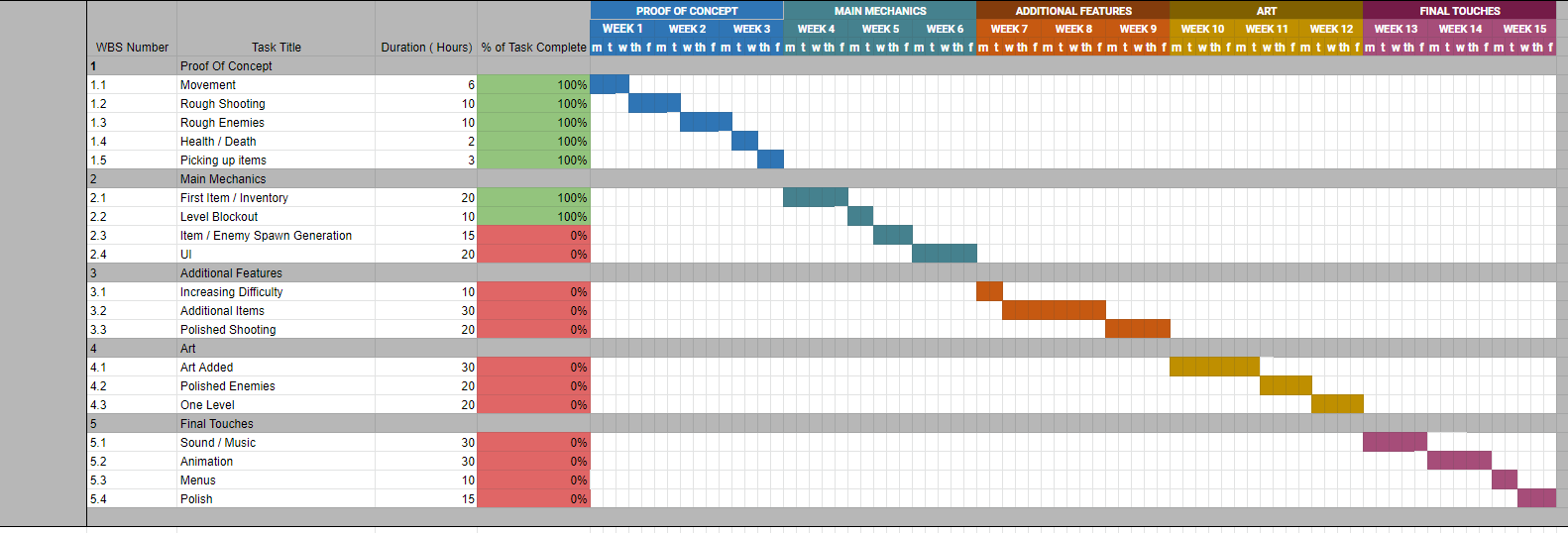 An agile timeline was created for this project. This was sectioned off into various production stages of the game. This went mostly to plan despite spending longer on certain sections than I had anticipated.
