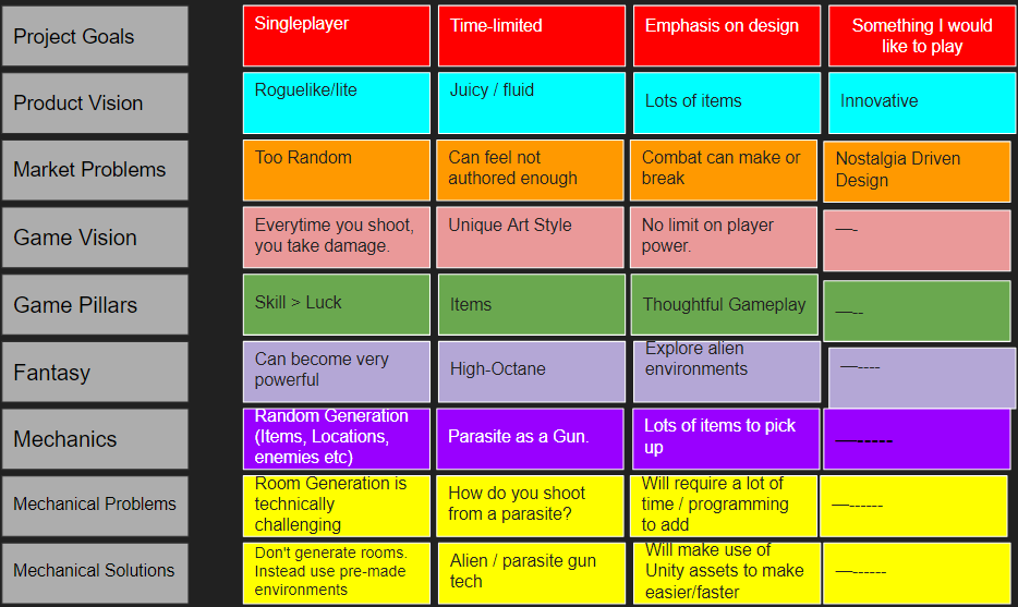 Due to this being a portfolio piece, it was important that the game highlighted my design abilities. One of the best ways that I can do this is by making the game as juicy as possible. The other best way that I can do this is by making the game have a twist on the genre and therefore I had to come up with a unique element that would be fun and interesting.